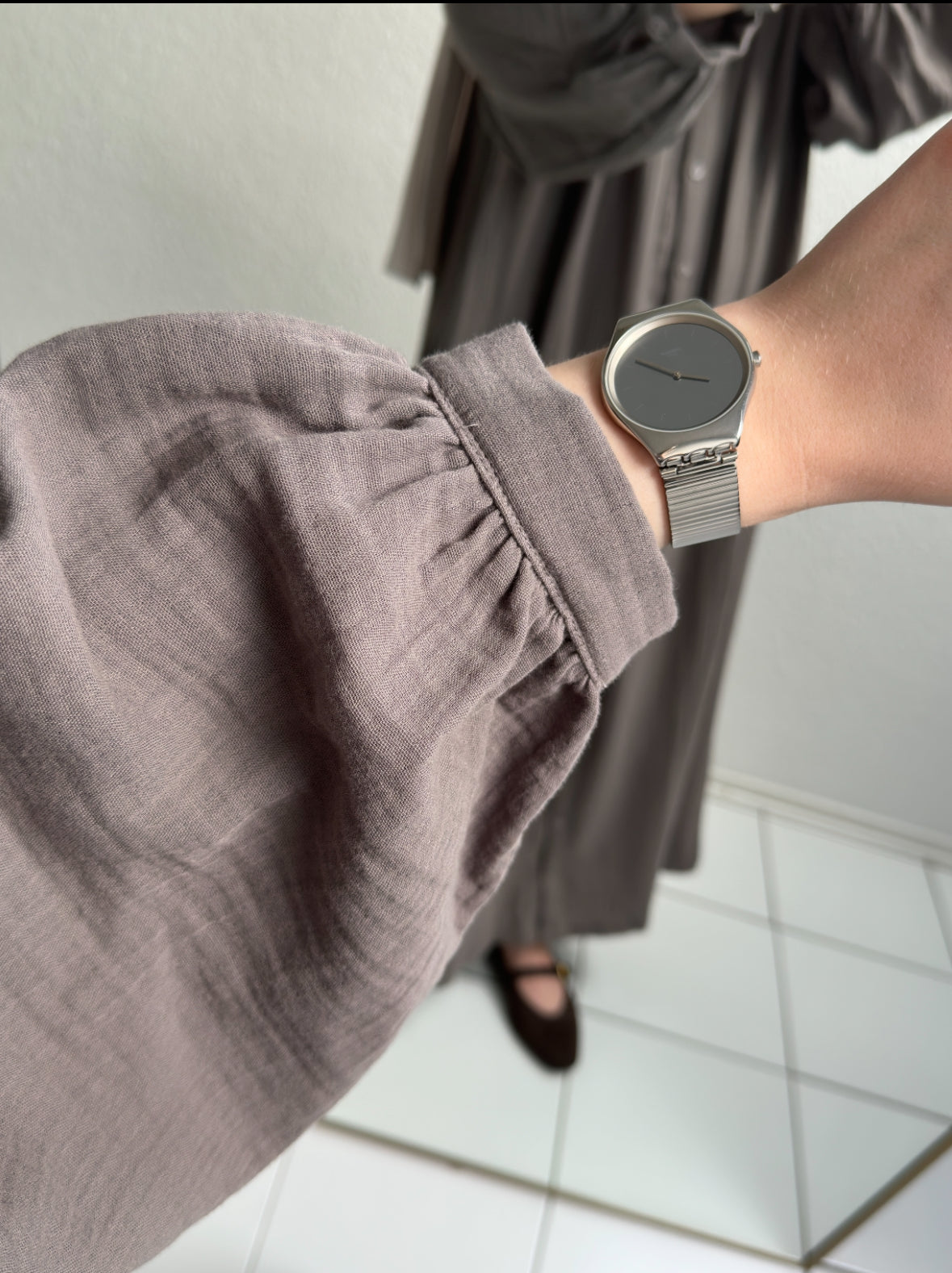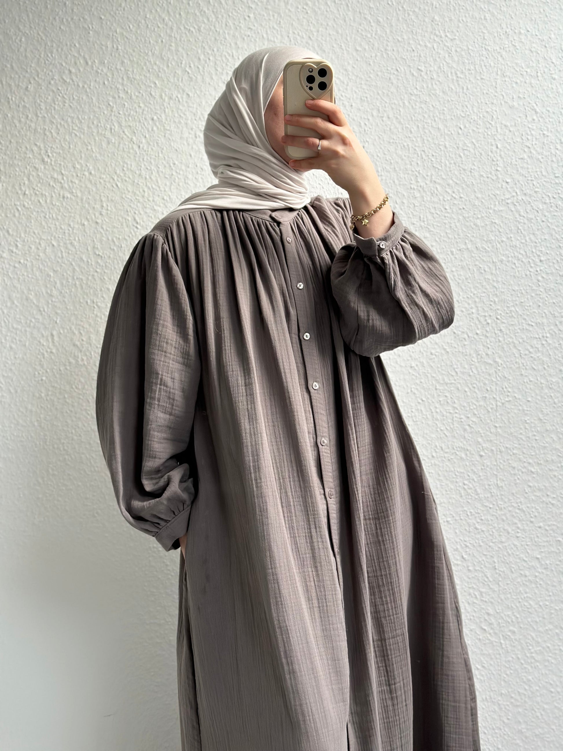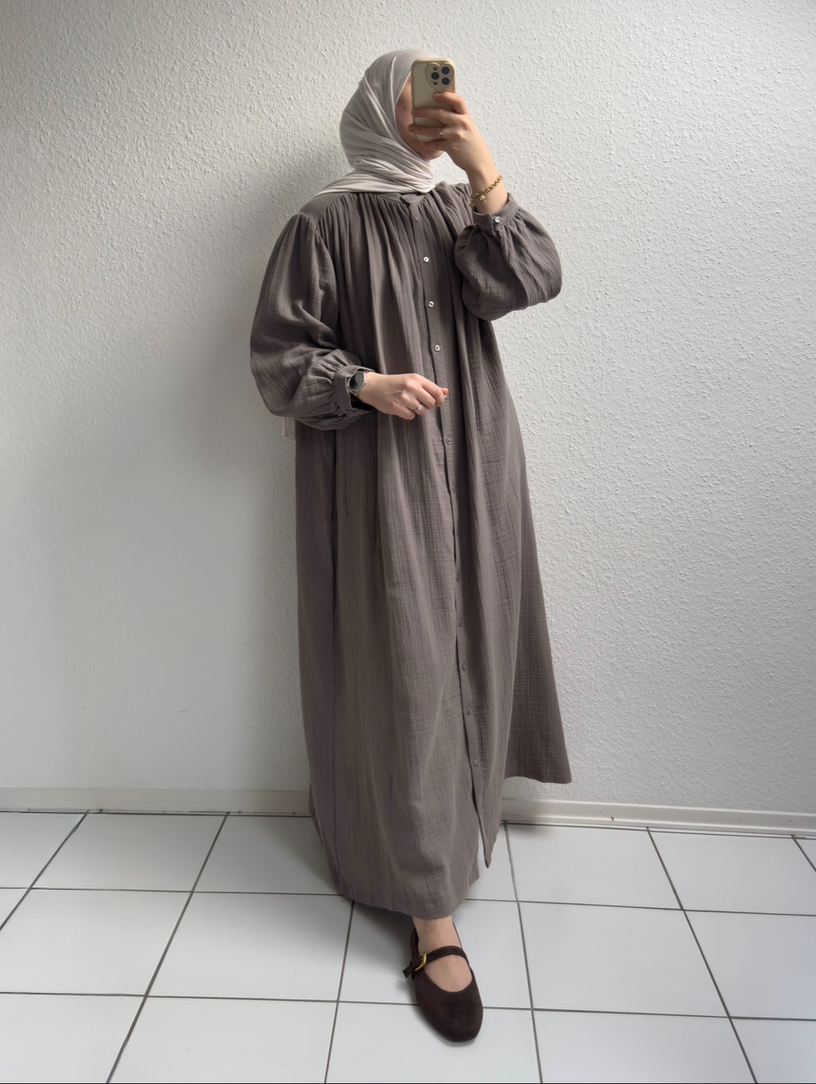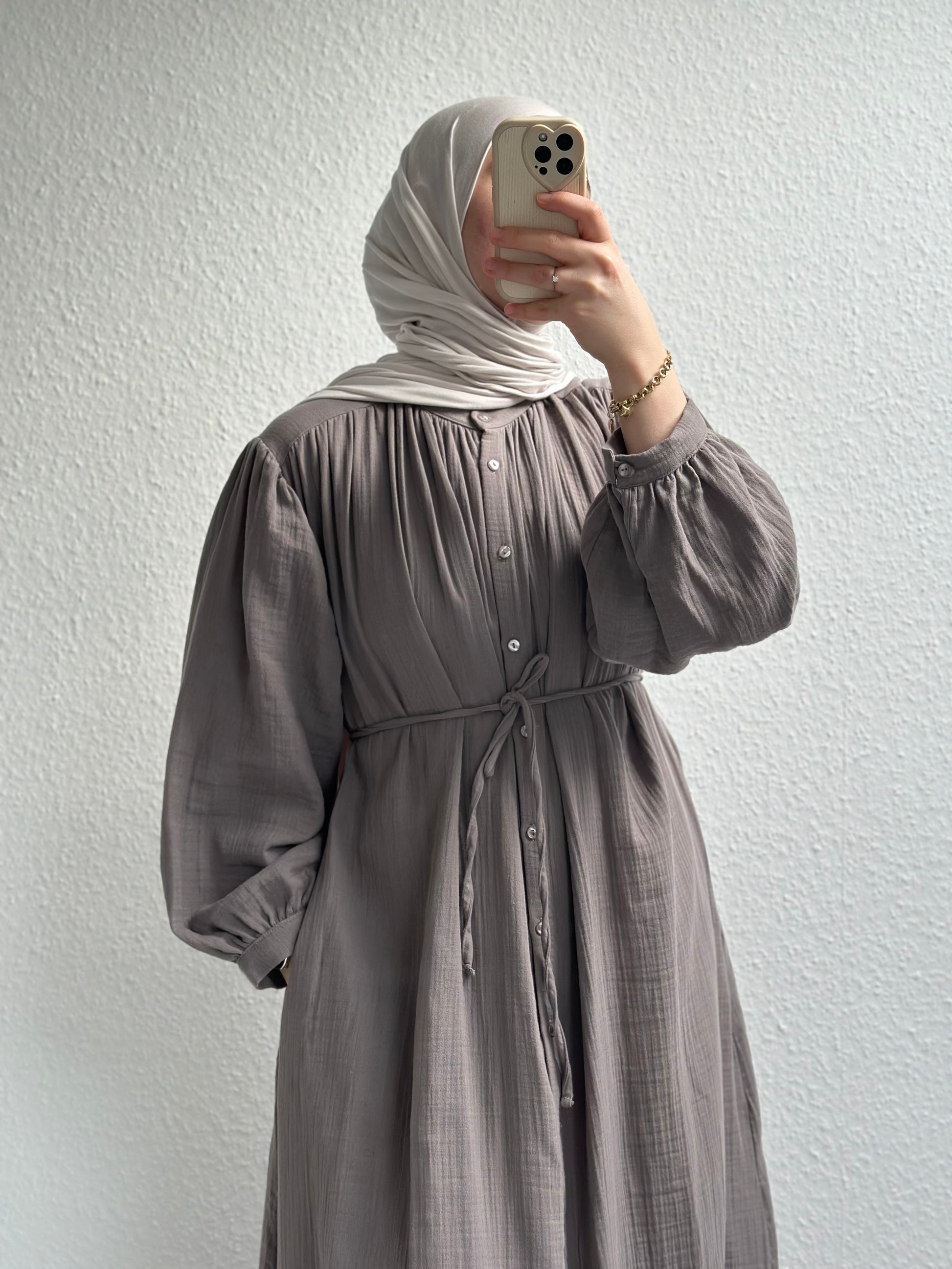 Dieses elegante Kleid ist durchgehend geknöpft, verfügt über seitliche Taschen und einen verstellbaren Bindegürtel in der Taille. Es eignet sich sowohl für den Alltag als auch für besondere Anlässe. Gefertigt aus leichtem Musselin, ist es ideal für den Sommer. Kombiniert mit unserem Jersey Hijab Nr. 2.