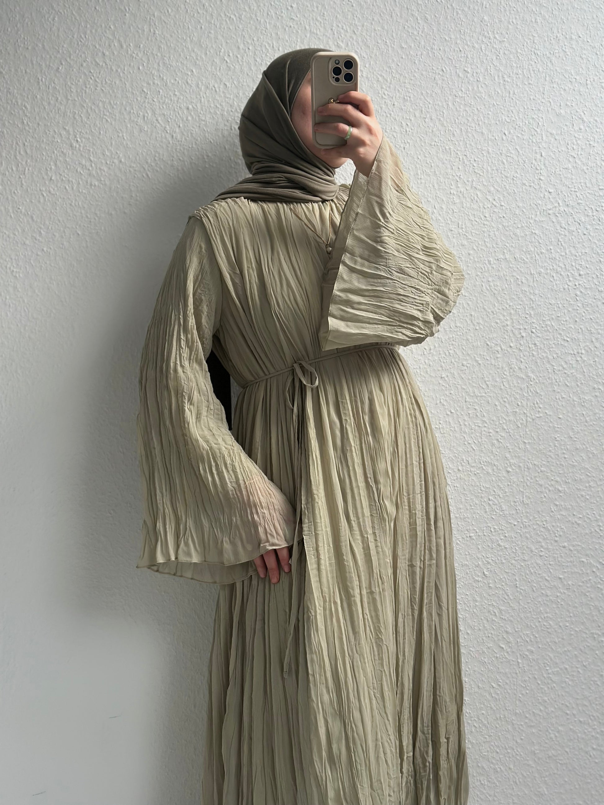Bu kibar elbisemiz kırışık şifon kumaştan üretildi ve ütü gerektirmez. Belden seyyar ince kemerli ve komple astarlıdır. Geniş kol detayları ile ayrı bir havası olan bu elbisemize bayılacaksınız. Hem günlük kullanım hem de özel bir gününüz için uygundur. 6 numaralı Penye Şalımız ile kombinlendi.