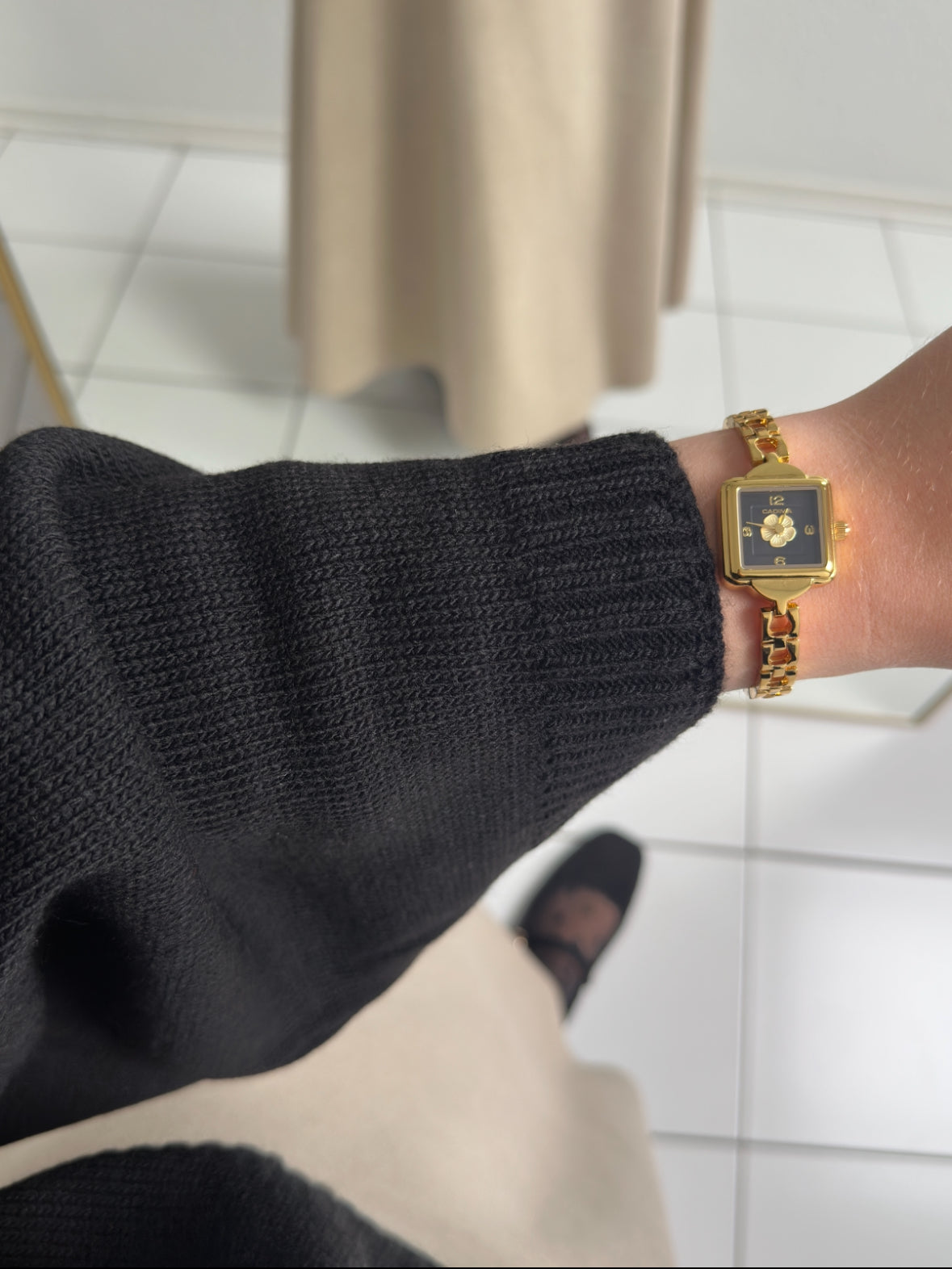 Für das Shooting wurde er mit dem Rock unseres Golden-Kaşe-Zweiteilers beige und dem Harmoni-Seidenschal in Gelb & Schwarz kombiniert.
