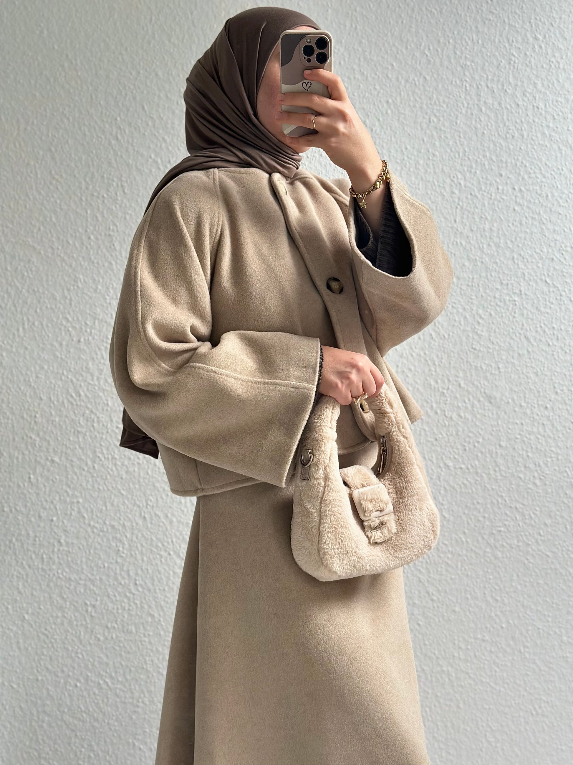 Soğuk havalarda sizi sıcacık tutacak bu yumuşacık etekli takımımızı deneyimlemelisiniz. Takımımız Ceket ve Etek olmak üzere 2 parçadan oluşmakta. Eteğin beli lastikli aşağıya doğru genişler ve yüksek bel. Ceket kalıp olarak oversize, ceketimizi farklı eteklerinizle, eteği farklı ceket ve kazaklarınızla da çok rahat kombinleyebilirsiniz. Çekimde ceketin içine Yarasa Kol İnce Triko kazaklarımızın kahve rengi ve şal olarak Penye şallarımızın 1 numaralı rengi kullanıldı.