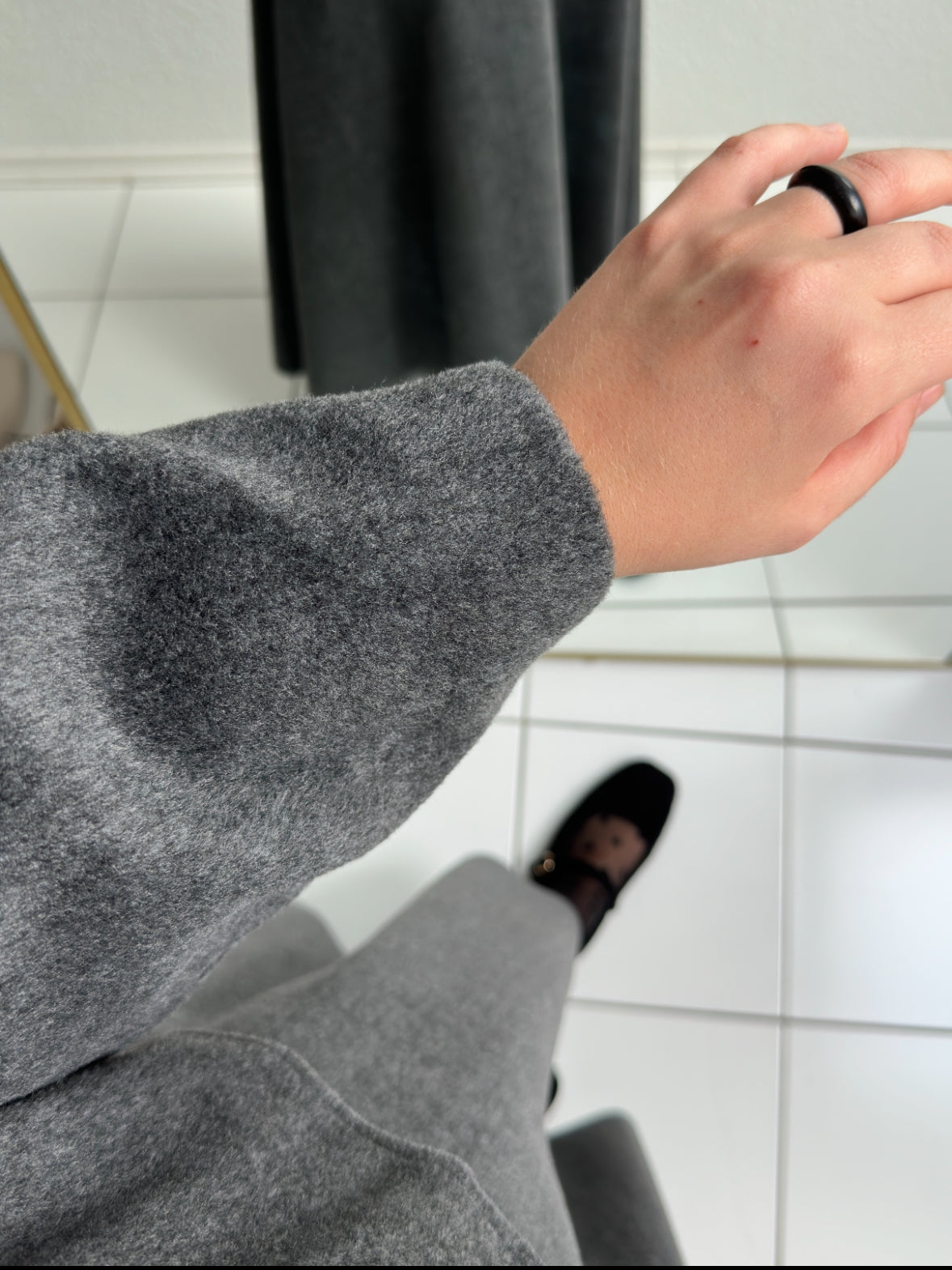 Auf den Fotos wurde unter der Jacke unser feiner Fledermausärmel-Strickpullover in Grausowie unser Penye-Schal in Farbe Nr. 10 getragen.