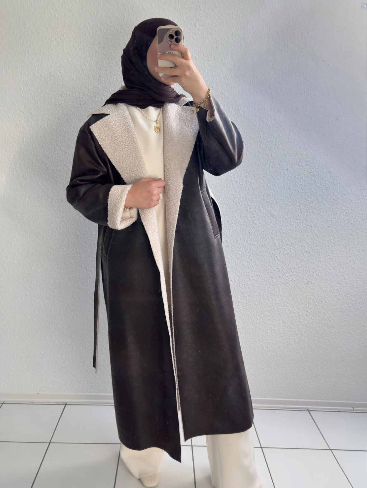 Dışı deri içi teddy olarak üretilen bu kabanımız asil ve zamansız tarzı ile hem içinizi hem dışınızı ısıtacak. Yanlardan cepli, kruvaze yaka ceketimiz aynı zamanda kemerlidir. Dilerseniz yaka kısmını daha çok kapatarak da kapalı yakla olarak kullanabilirsiniz. Hem şık hem spor kombinler yapabileceğiniz ağırlığı olan çok hoş bir kaban. İçerisine Şeritli Bej Triko takımımız ile kombinlendi.