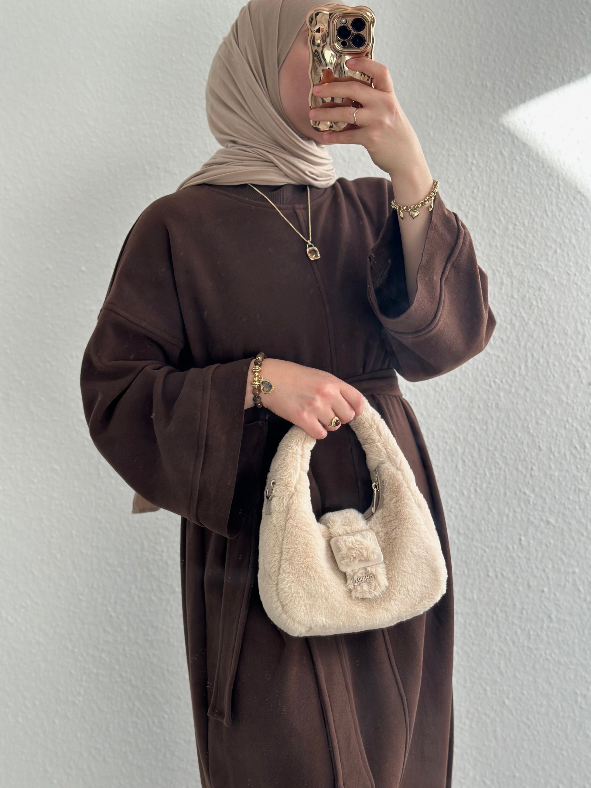 Soft Basic elbisemiz oldukça rahat, yumuşak ve sıcacıktır. İster kemerli ister kemersiz olarak kullanabilirsiniz. Model olarak düşük omuzludur. Penye Jersey şallarımızın 3 numaralı rengi ile kombinlendi.