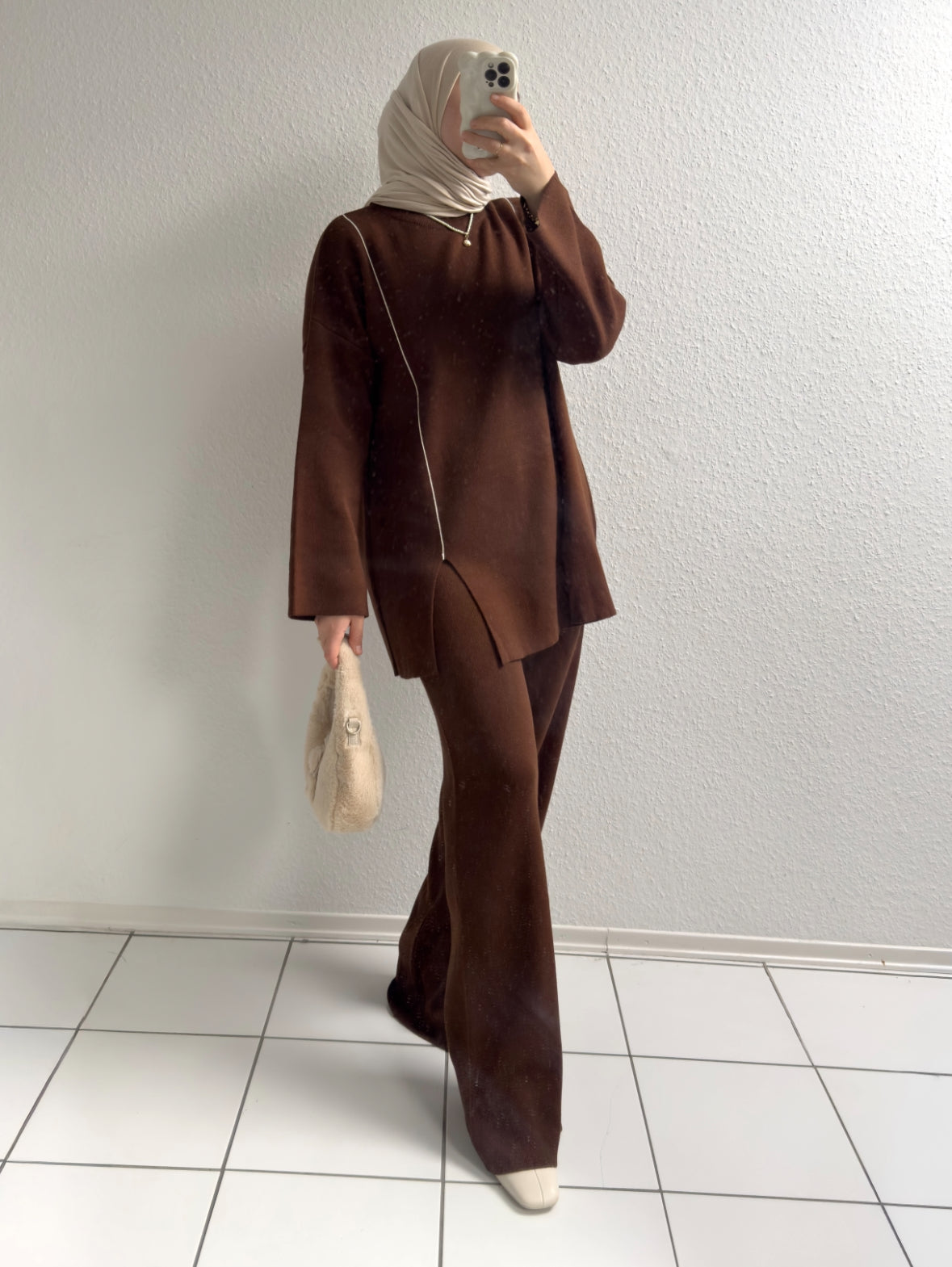 Unser warmes, weiches und zugleich elegantes Set besteht aus einer Tunika mit seitlichen Streifen und kleinen Schlitzen am Saum.
