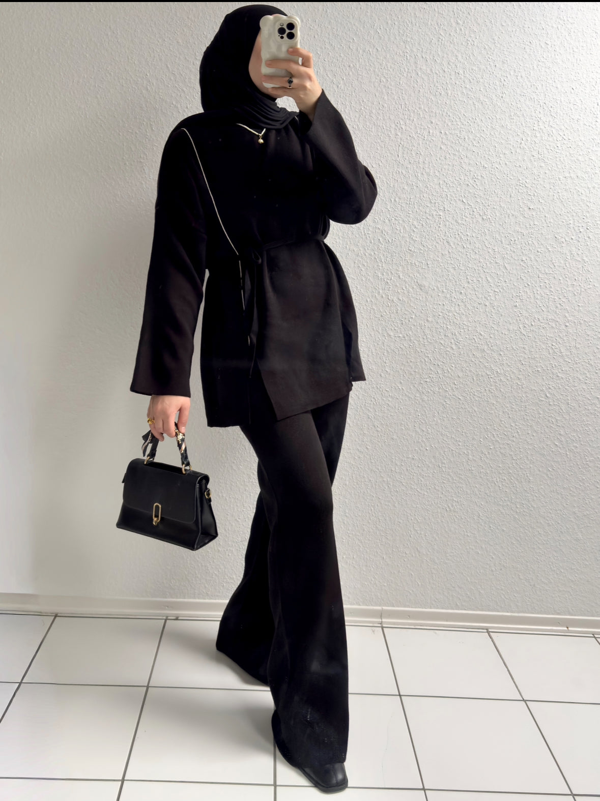 Unser warmes, weiches und zugleich elegantes Set besteht aus einer Tunika mit seitlichen Streifen und kleinen Schlitzen am Saum.