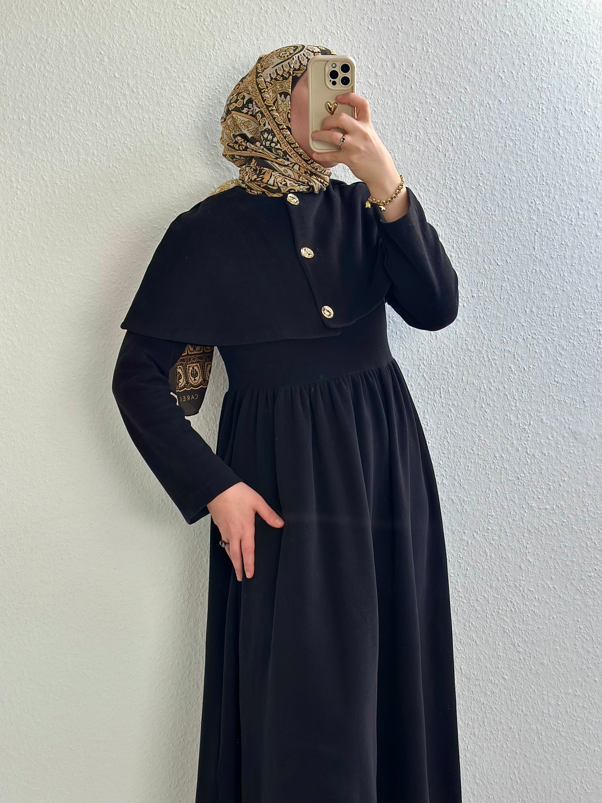 Mit den goldenen Knöpfen am Cape und dem einzigartigen Schnitt des Kleides fühlst du dich wie eine Prinzessin aus einem Märchen 💖 Unser Kleid hat ein leicht figurbetontes Oberteil und besteht aus einem dehnbaren, angenehmen Stoff.