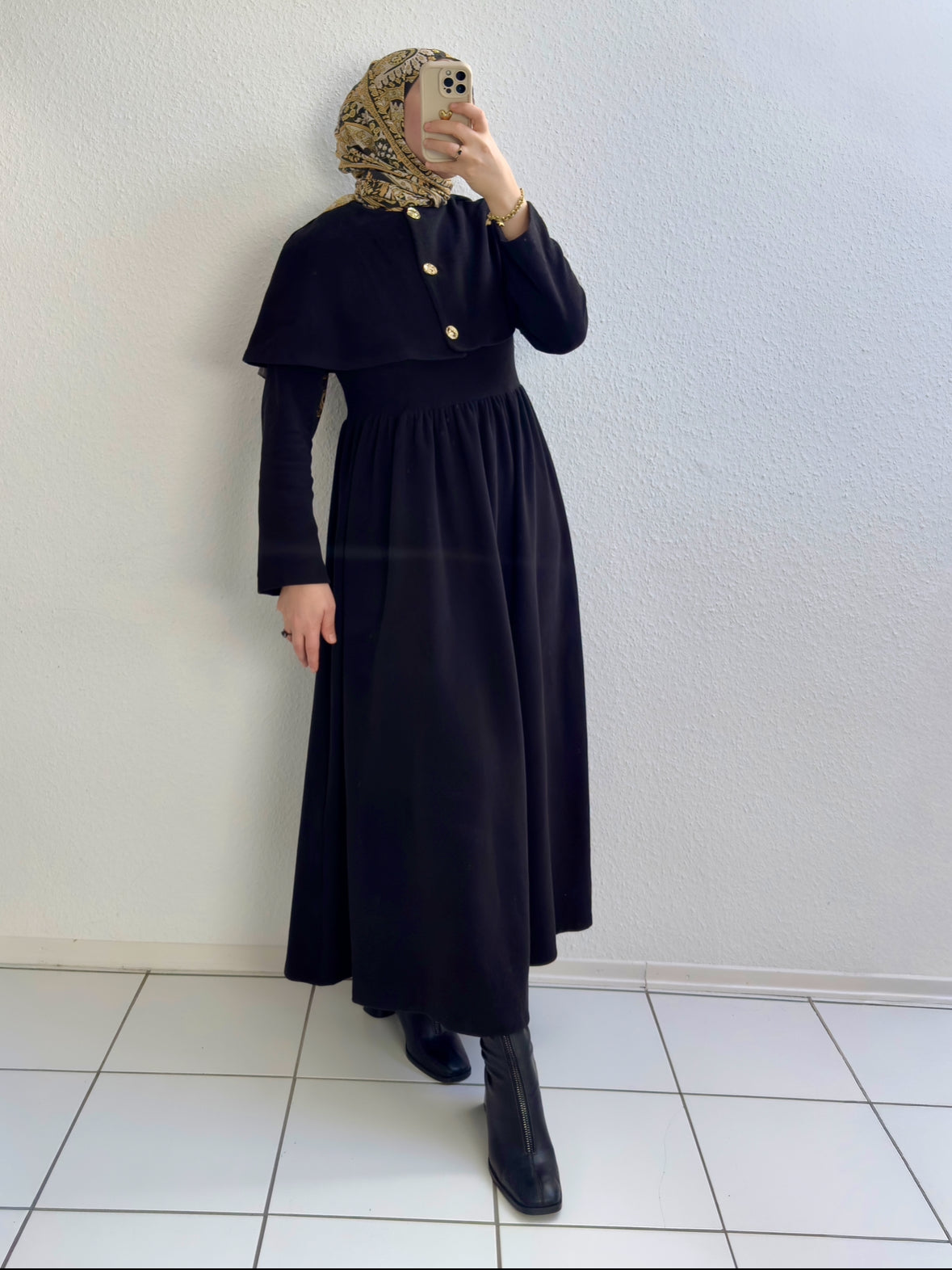 Pelerindeki gold düğmeler ve elbisenin özel kesimiyle, içinde kendini adeta bir prenses gibi hissedeceğin masalsı bir parça 💖Elbisemiz, üst kısmı hafif oturan bir modele sahip olup, hafif esnek yapılı bir kumaştan üretilmiştir.