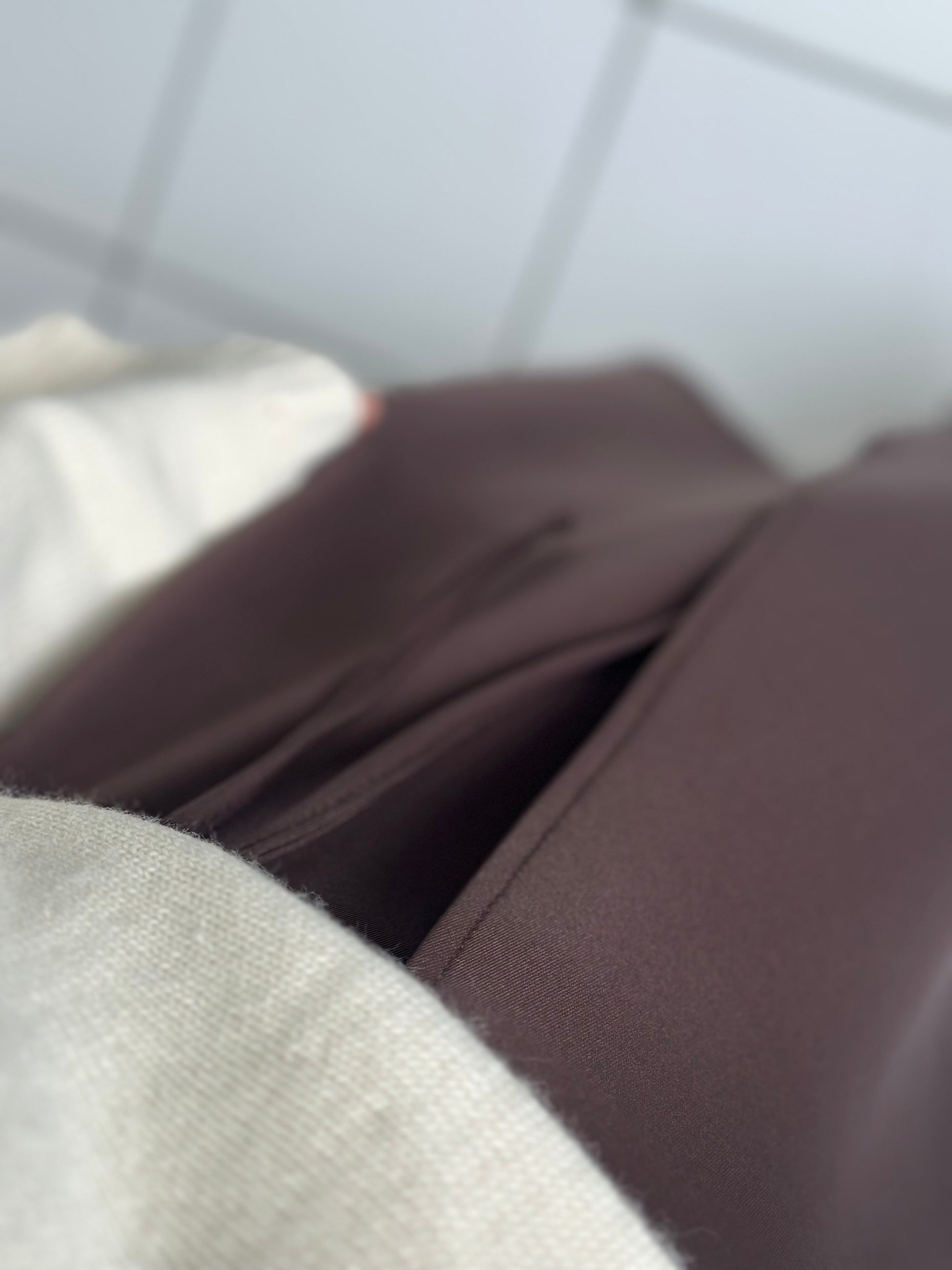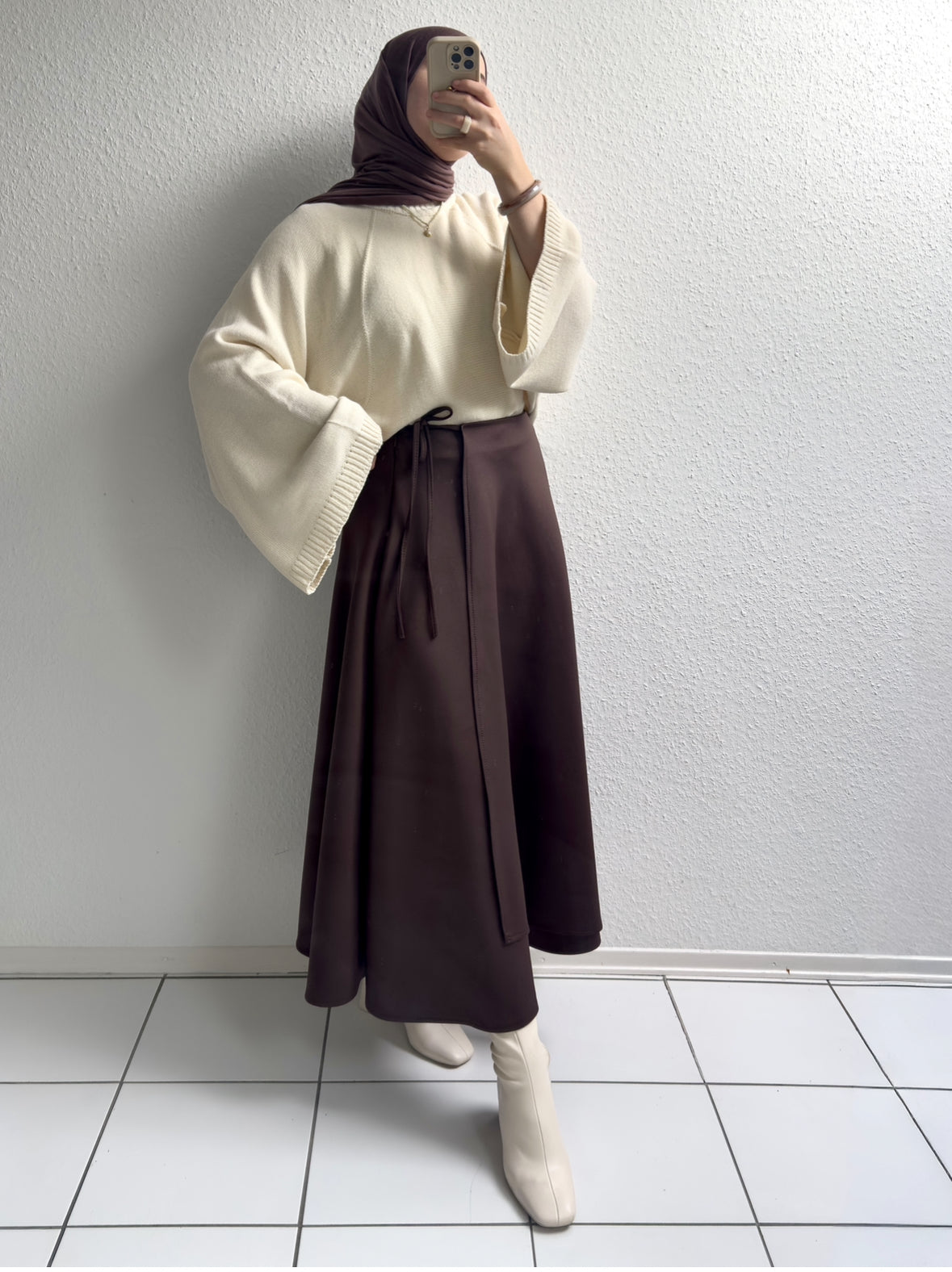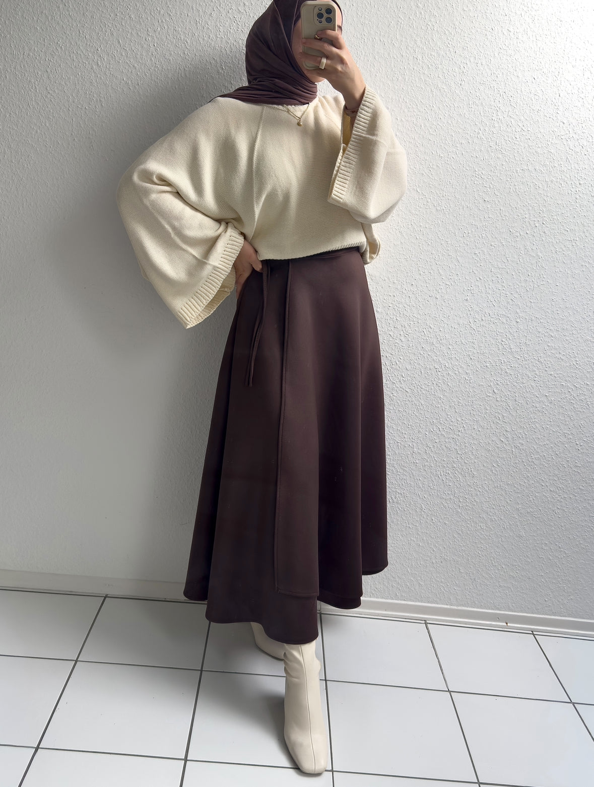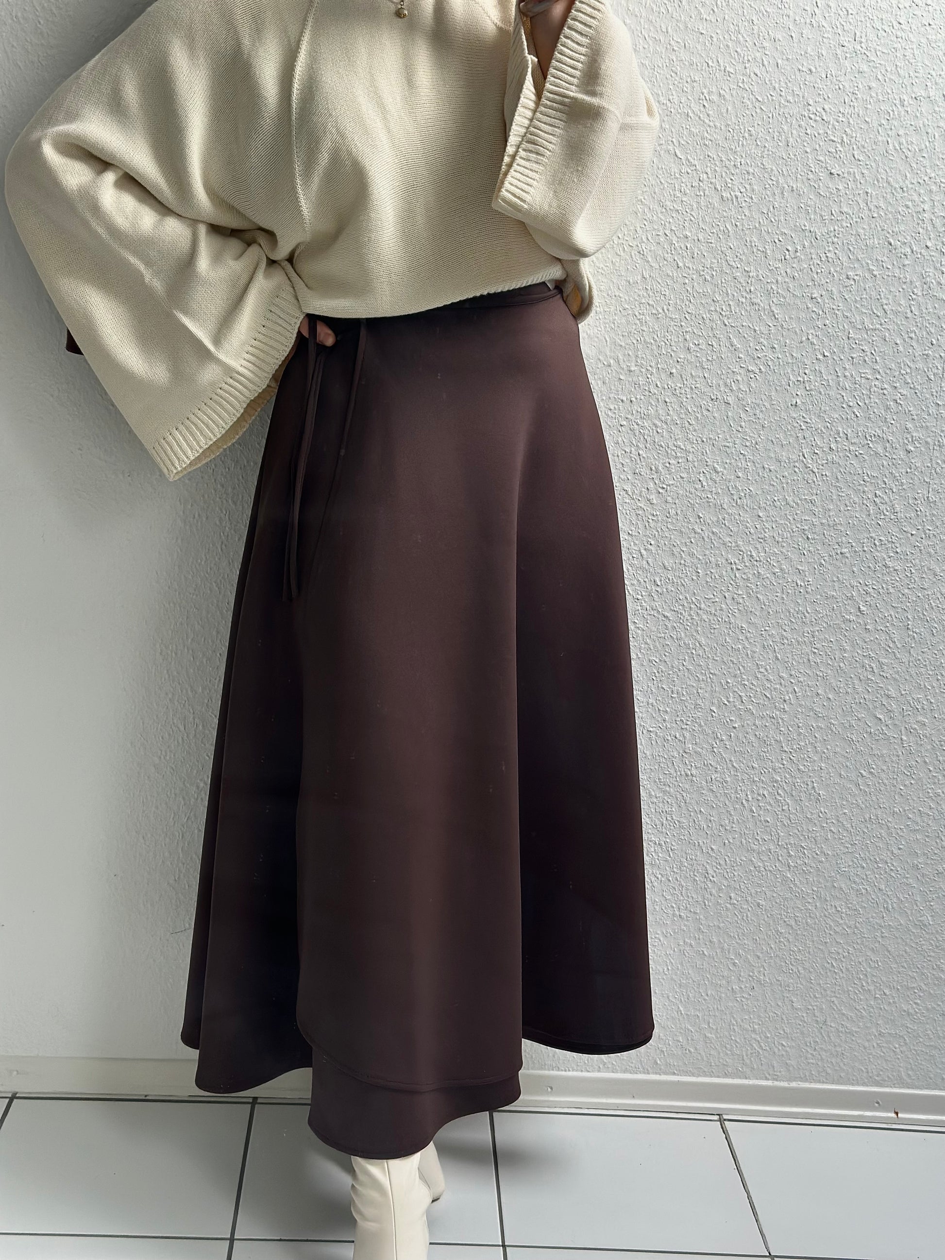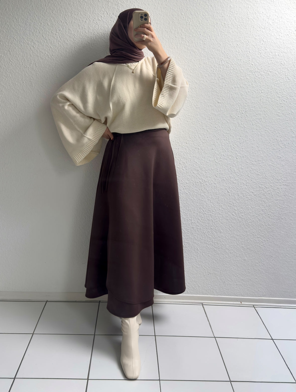 Scuba kumaş eteğimiz yandan fermuarlı ve aynı zamanda iplidir. Bu ip sayesinde eteği sıkılaştırabilirsiniz. Dikişli ek parça, çift kumaş detayıyla daha havalı bir görünüm sunar. Model olarak aşağıya doğru genişleyen kloş kesimdedir. Yarasa kol triko kazağımızın bej rengi be 10 Numaralı Penye şalımız ile kombinlendi. Çizmelerle kısa cekerlerle harika kombinler yapabileceğiniz bir etek ✨