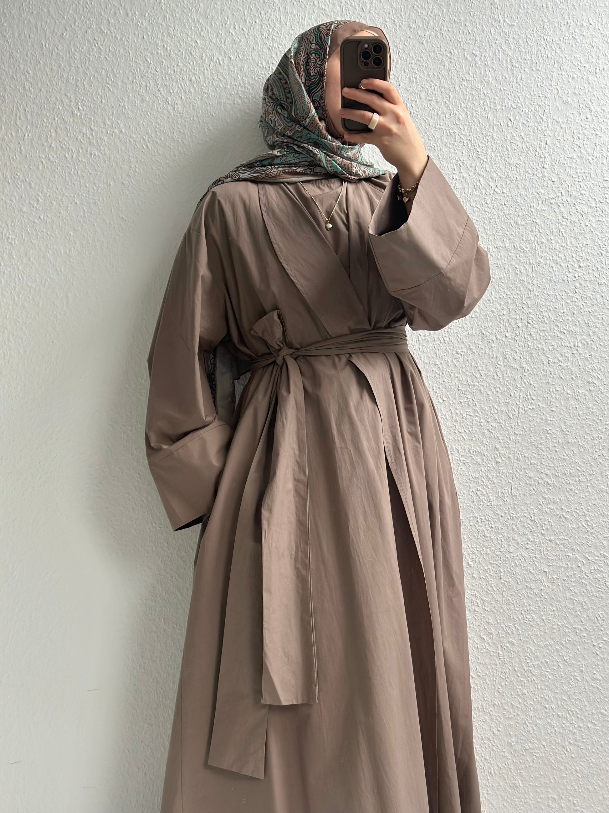 Unsere lässige Abaya besteht aus 100 % Baumwollstoff und ist in weitem Schnitt gefertigt. Sie wird als zweiteiliges Set angeboten: ärmelloses Innenkleid und langärmelige Jacke. Sie verfügt über einen passenden, breiten Gürtel. Diese leichte Abaya eignet sich perfekt für Ramadan- und Feiertagsanlässe. Sowohl schick als auch sportlich kombinierbar, können Jacke und Innenkleid auch einzeln getragen werden.