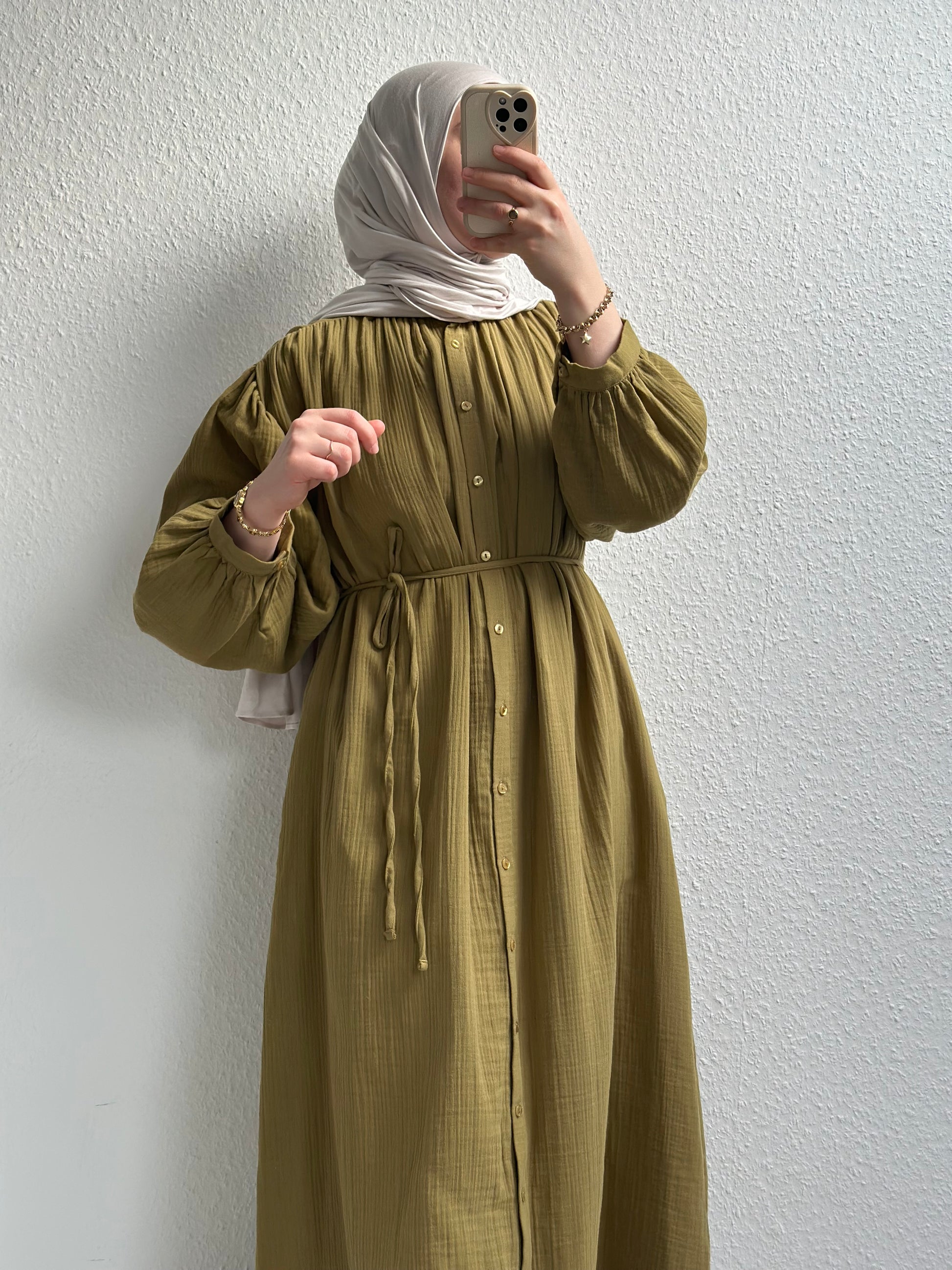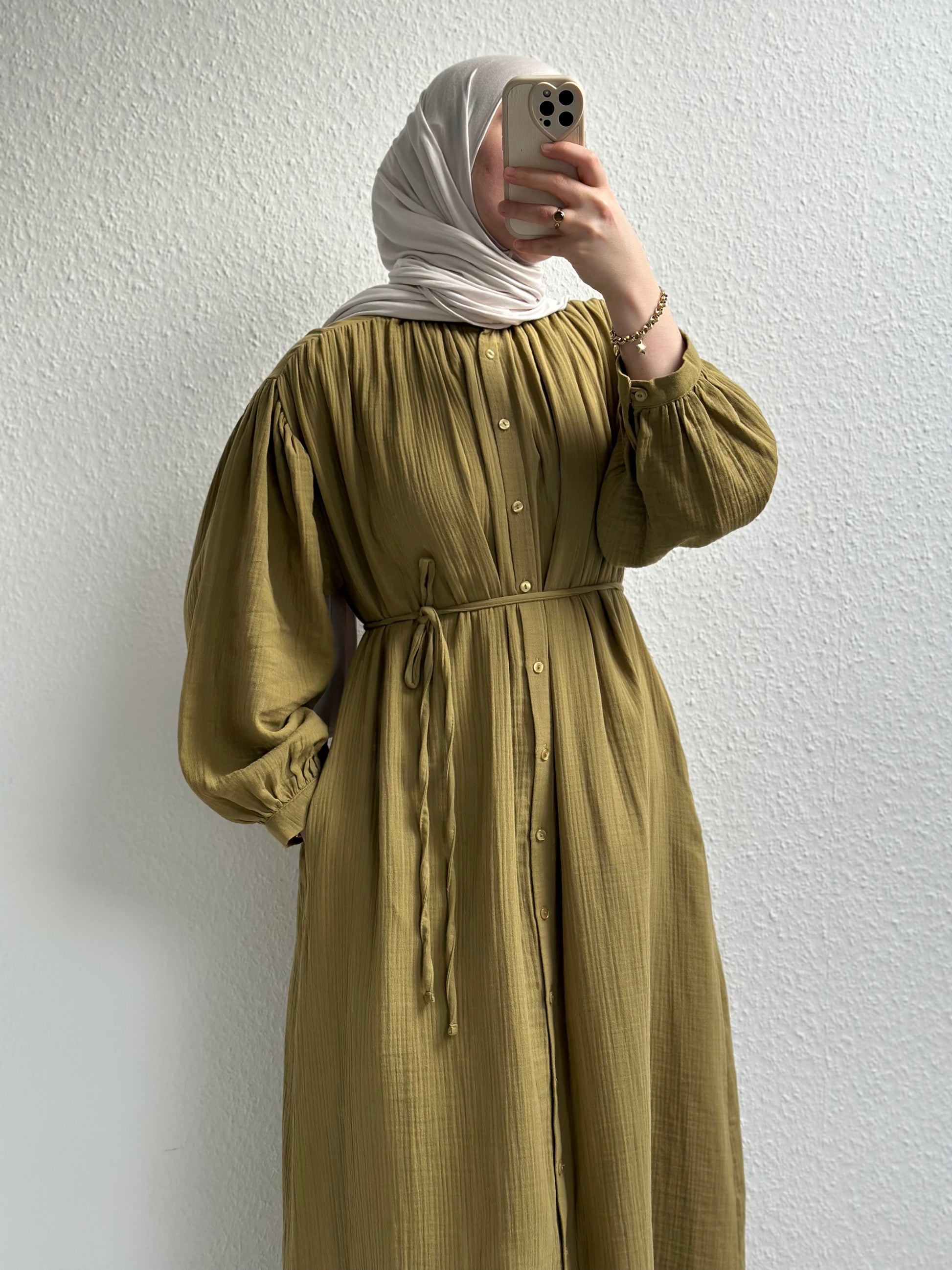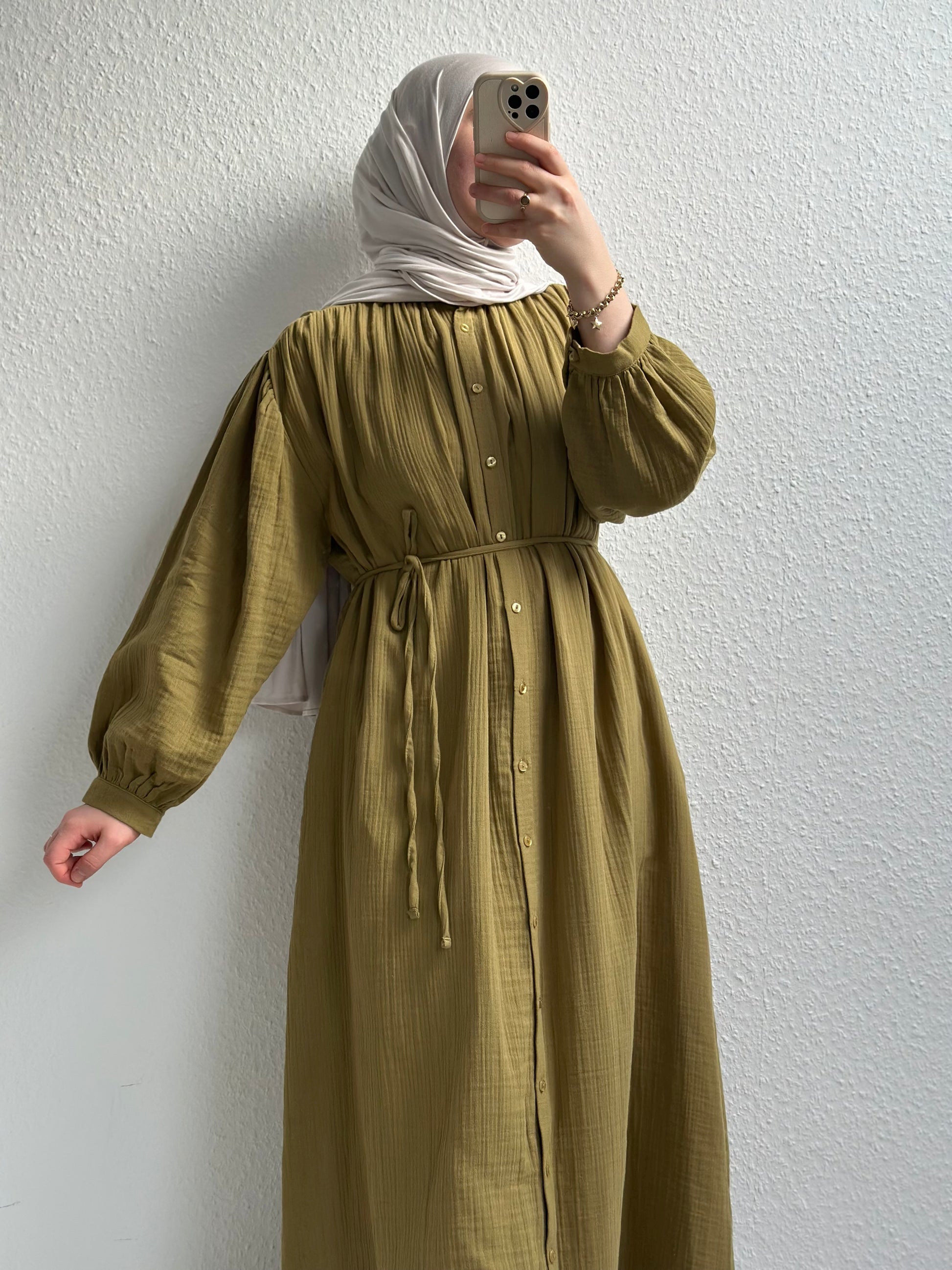 Dieses elegante Kleid ist durchgehend geknöpft, verfügt über seitliche Taschen und einen verstellbaren Bindegürtel in der Taille. Es eignet sich sowohl für den Alltag als auch für besondere Anlässe. Gefertigt aus leichtem Musselin, ist es ideal für den Sommer. Kombiniert mit unserem Jersey Hijab Nr. 2.