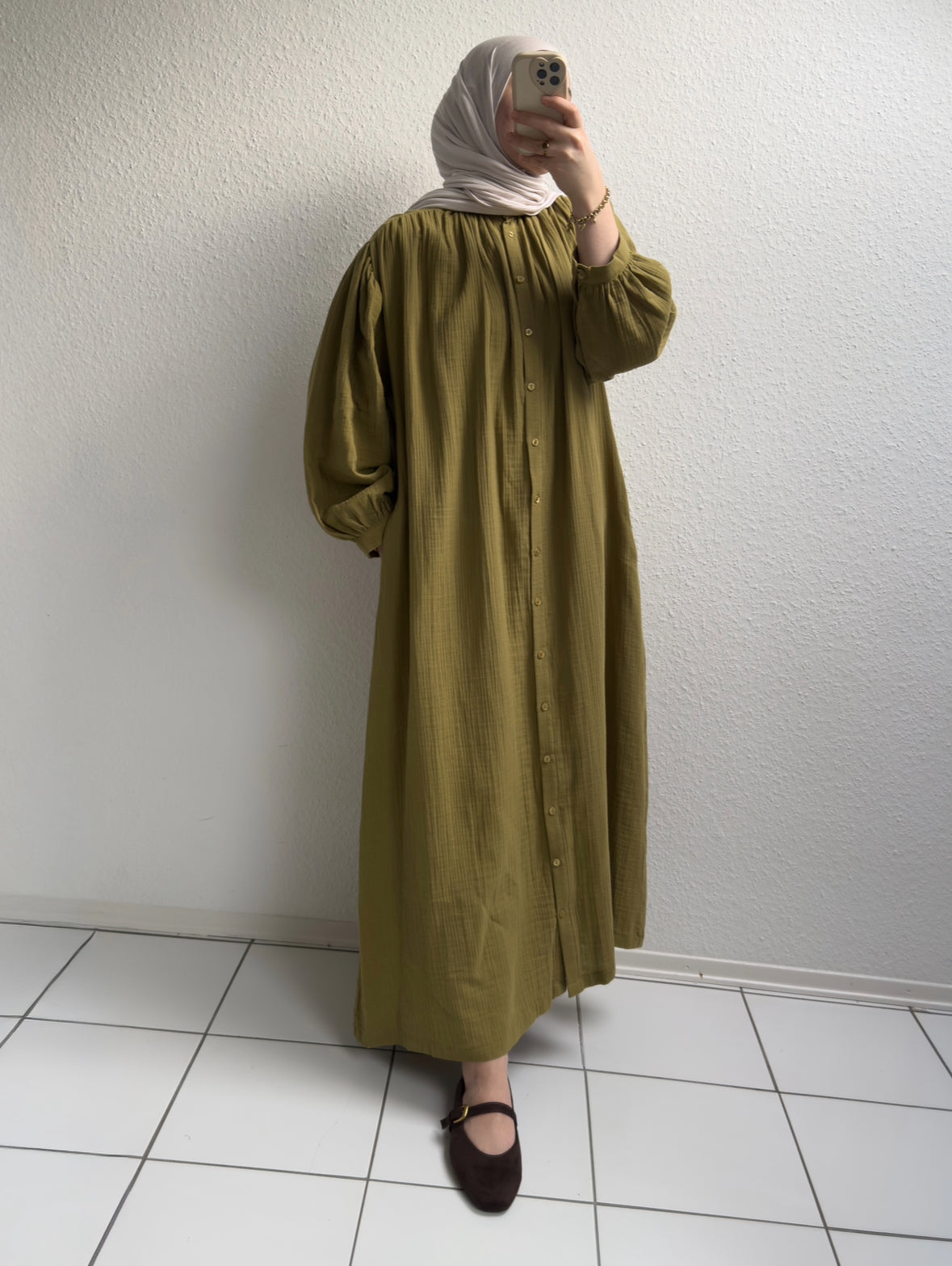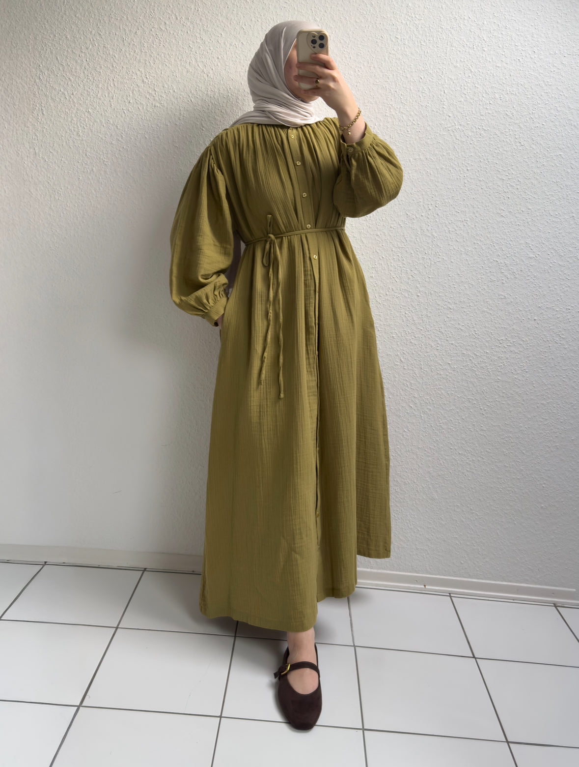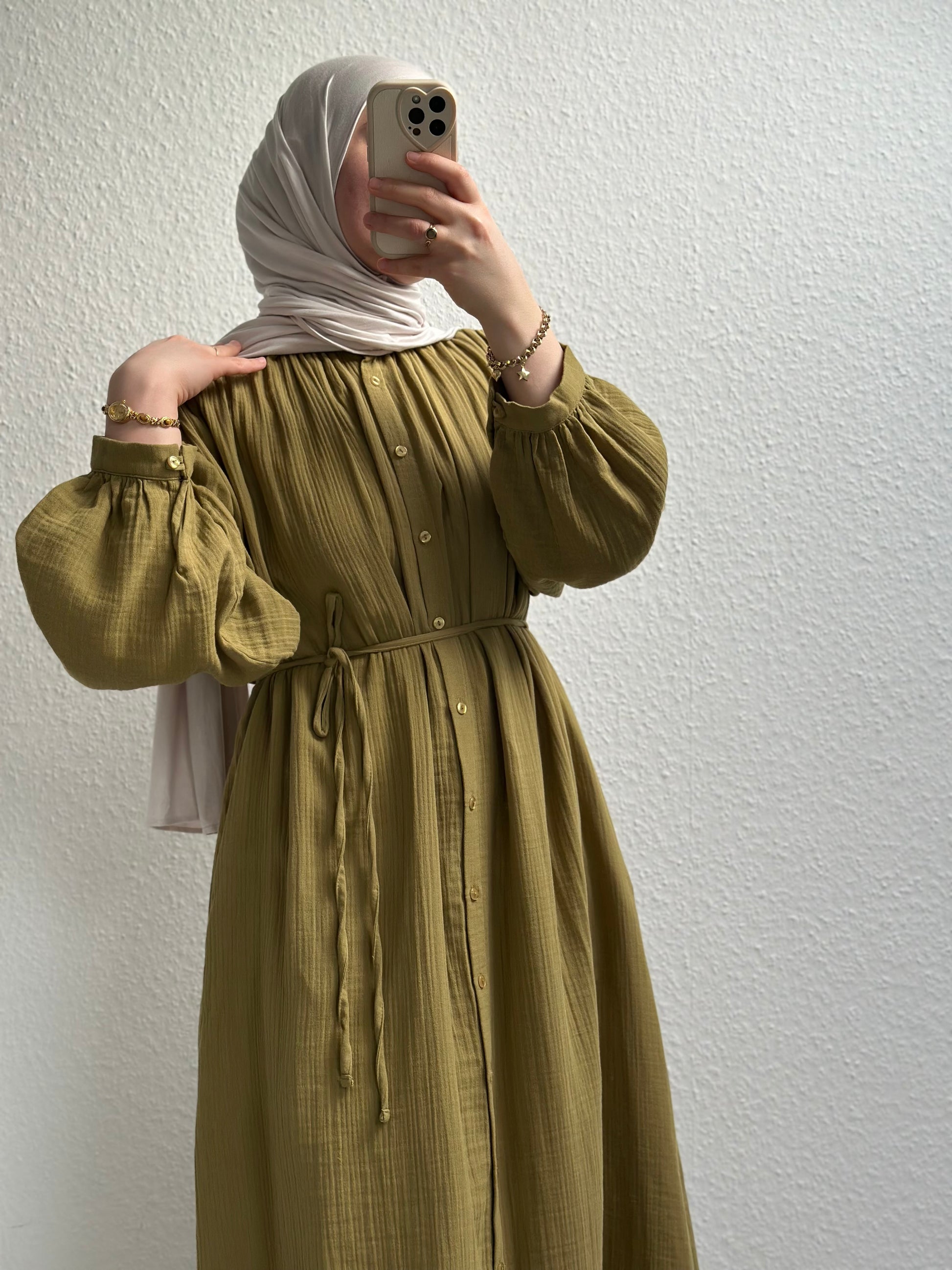 Dieses elegante Kleid ist durchgehend geknöpft, verfügt über seitliche Taschen und einen verstellbaren Bindegürtel in der Taille. Es eignet sich sowohl für den Alltag als auch für besondere Anlässe. Gefertigt aus leichtem Musselin, ist es ideal für den Sommer. Kombiniert mit unserem Jersey Hijab Nr. 2.